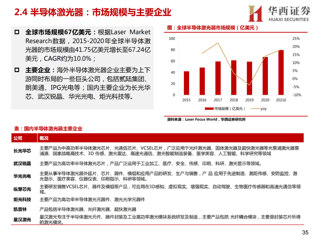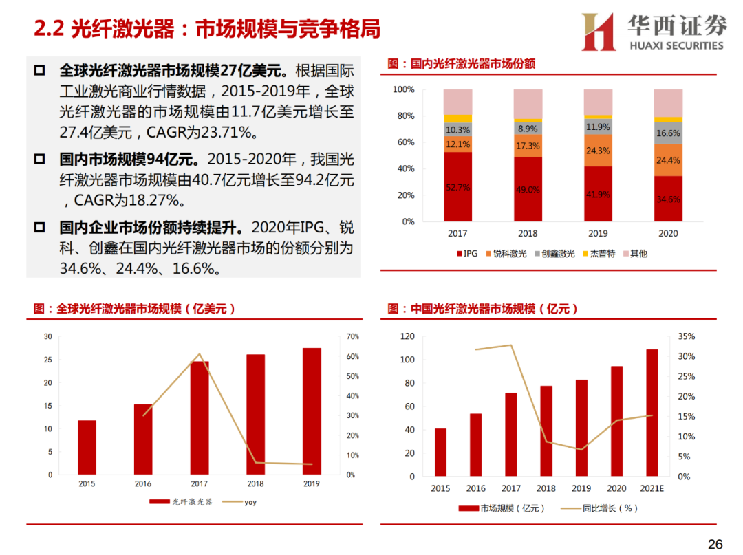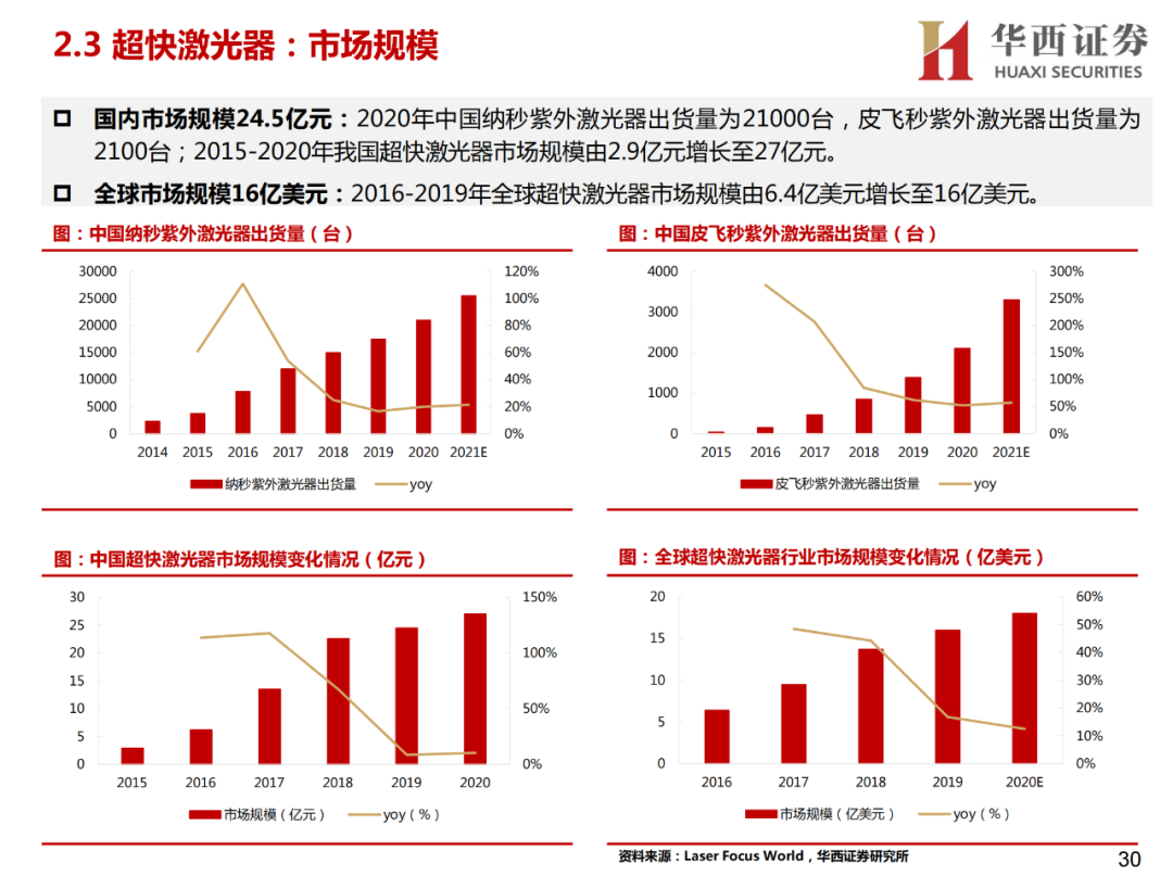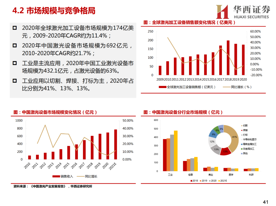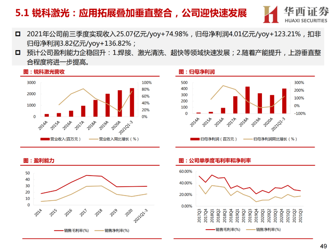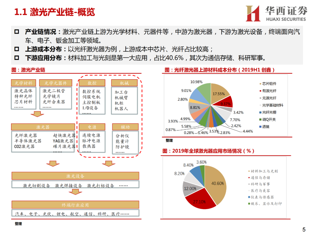 激光行业短期随宏观波动,长期持续成长可期。(1)行业短期跟随宏观周期和下游行业进行波动,长期受益于渗透率提升和新领域持续拓展;(2)行业处于成长期,增长空间巨大,建议关注产业链各环节具备竞争优势的企业;(3)激光替代传统加工、清洗熔覆等新应用持续拓展、下游光伏锂电等行业高速增长,三大因素推动激光行业发展。