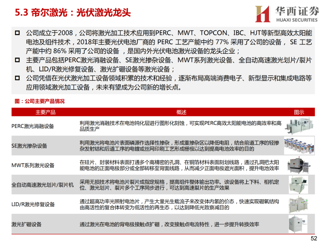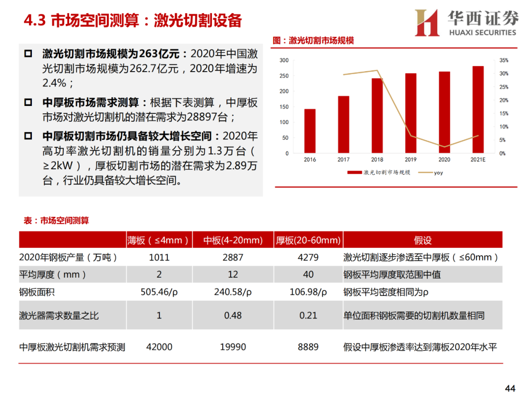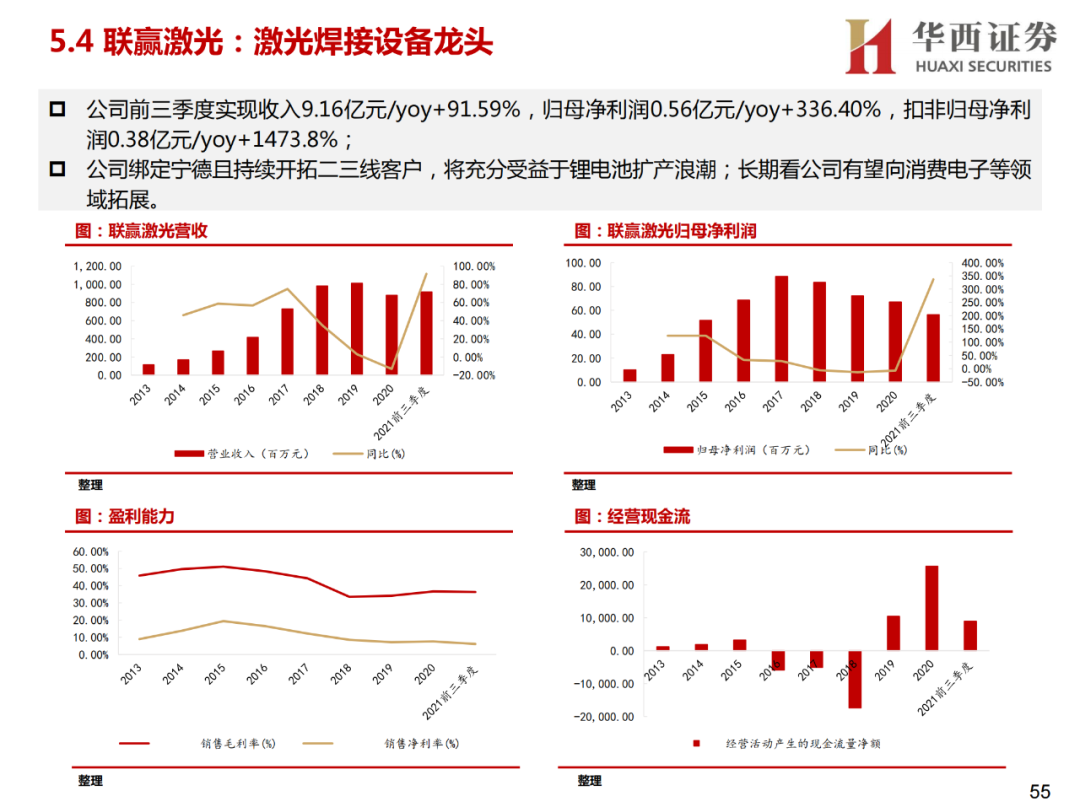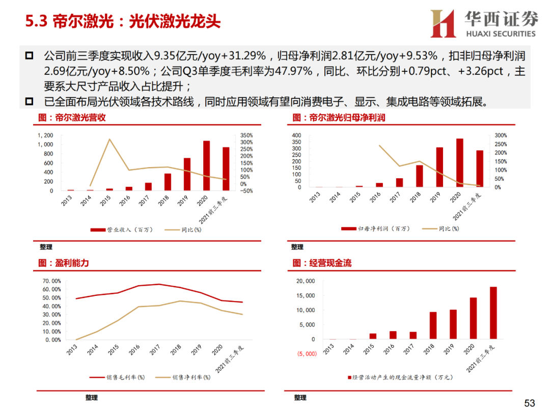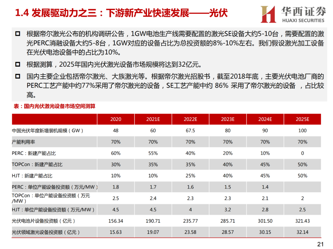 激光设备:下游多点开花加速行业发展。(1)渗透率提升是行业持续发展的根本动力,近年来激光器价格下降带动设备价格下降,激光设备经济性提高,行业渗透率加速提升;(2)切割焊接仍具备极大增长空间,此外新应用拓展持续拓宽赛道;(3)下游光伏、锂电等高景气领域需求旺盛,相关激光设备企业具备综合优势(即懂激光技术,又具备相关领域的工艺积累);(4)建议关注高景气细分领域,相关受益标的有:帝尔激光(光伏激光设备龙头)、联赢激光(激光焊接设备龙头)、海目星(优质锂电激光设备企业)。