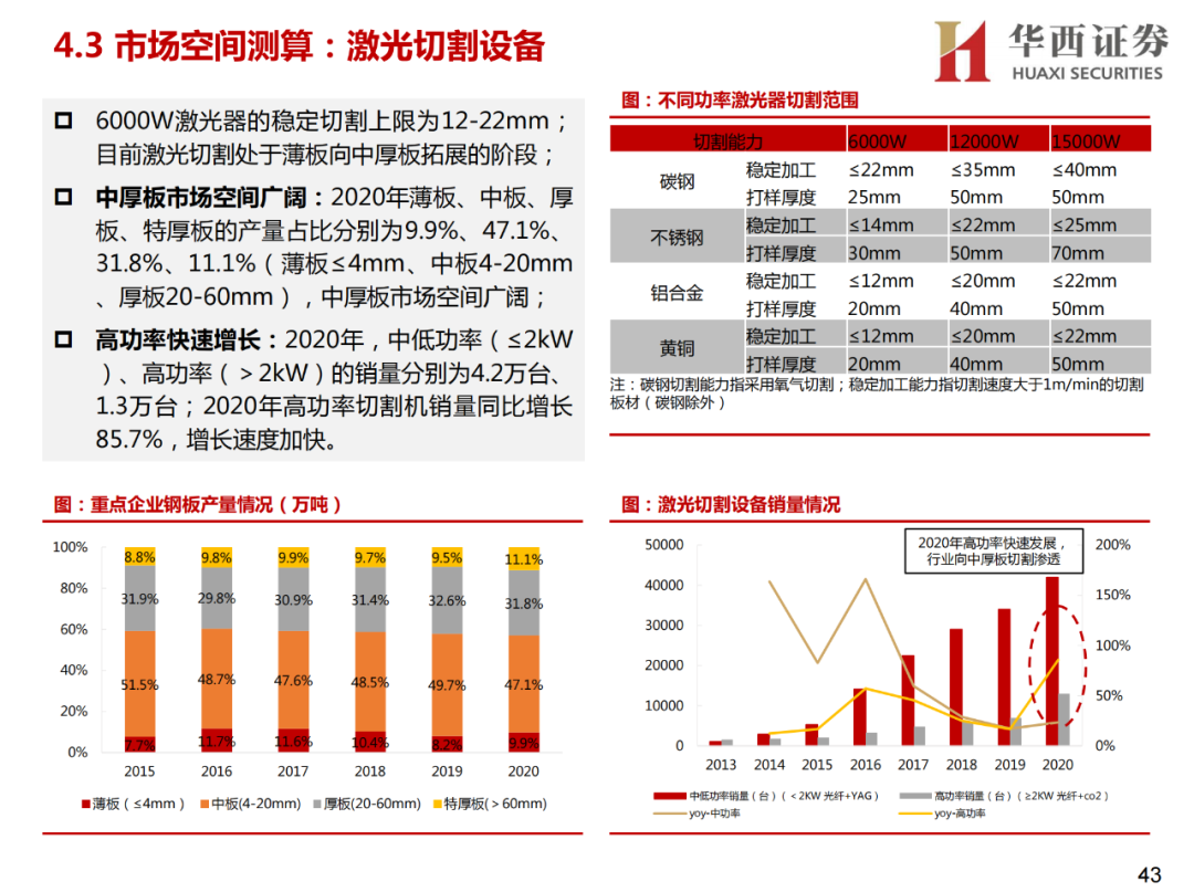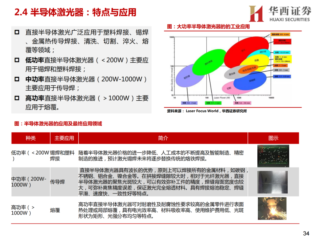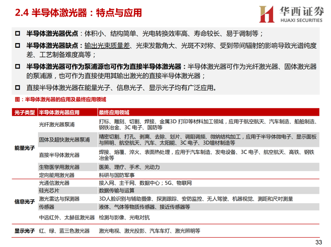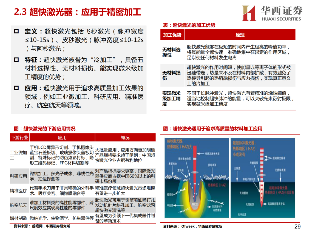 激光器:光纤激光器目前为主流,半导体/超快激光器具备较大潜力。(1)光纤激光器:高功率国产化推动国内企业发展,价格竞争趋缓叠加进一步垂直整合,国内企业盈利能力趋稳;(2)超快激光器:特点是“冷加工”,用于追求高质量的加工领域,发展十分迅速,国内多个企业进行布局;(3)半导体激光器:优缺点明显,技术不断进步,发展潜力巨大。