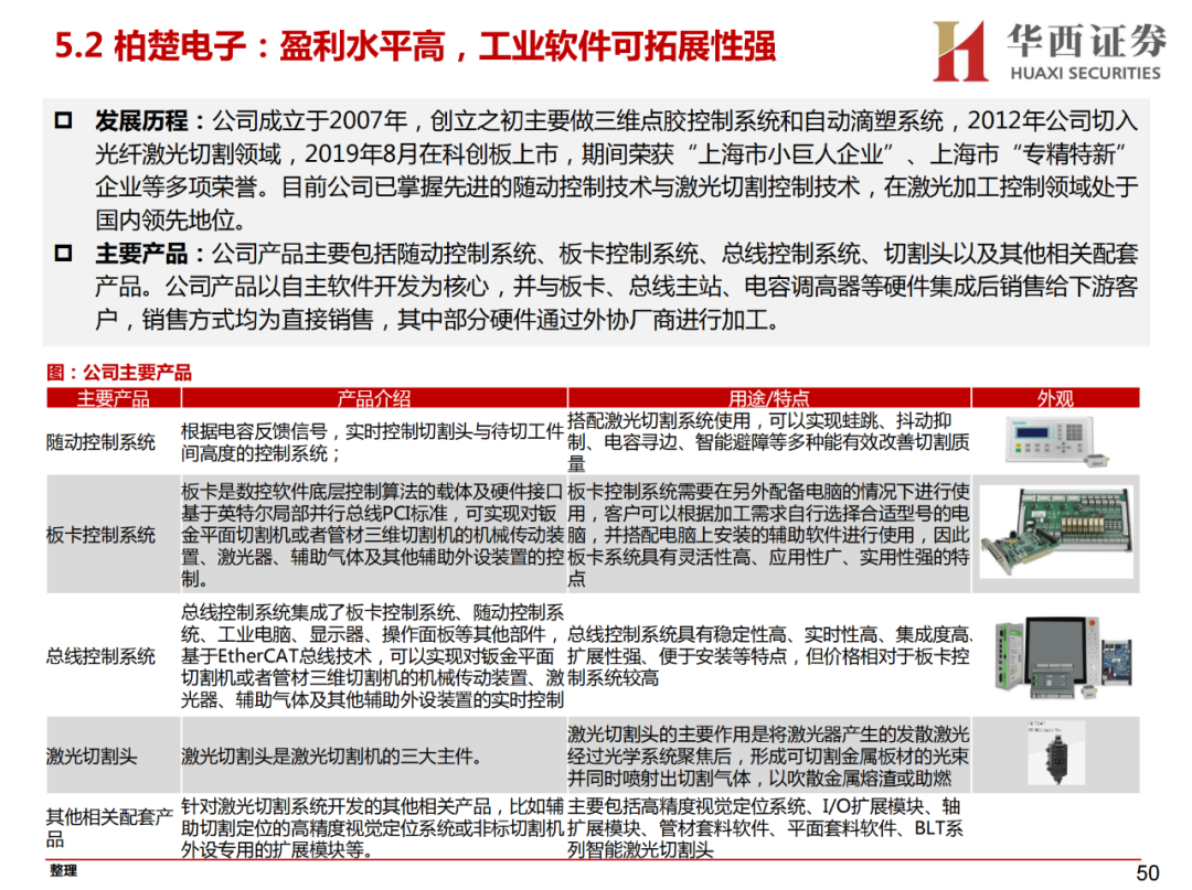 运控系统:竞争格局佳,工业软件可拓展性强。(1)激光切割运动控制系统低功率已基本国产化,高功率国产化正在推进;(2)产品价格稳定,行业降价情况下受益于销量的快速提升;(3)工业软件具备极强可拓展性;行业龙头柏楚电子的产业拓展路径:以软件带硬件拓展切割头,拓展超快运控系统,拓展智能焊接机器人。