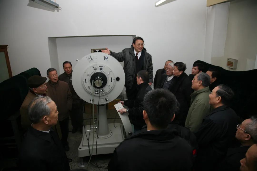 李景镇(中间)在爆轰实验室现场向鉴定委员会的10位院士和5位专家介绍SSF摄影仪性能和关键技术。
