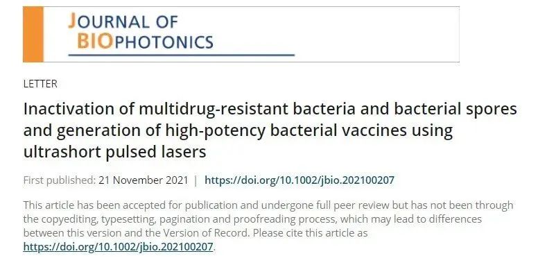 11 月 21 日,相关研究结果以论文形式在 Journal of Biophotonics 上在线发表,该论文以《使用超短脉冲激光灭活多重耐药菌和细菌孢子并产生高效细菌疫苗》(Inactivation of multidrug‐resistant bacteria and bacterial spores and generation of high‐potency bacterial vaccines using ultrashort pulsed lasers)为题,曾绍伟为第一作者。