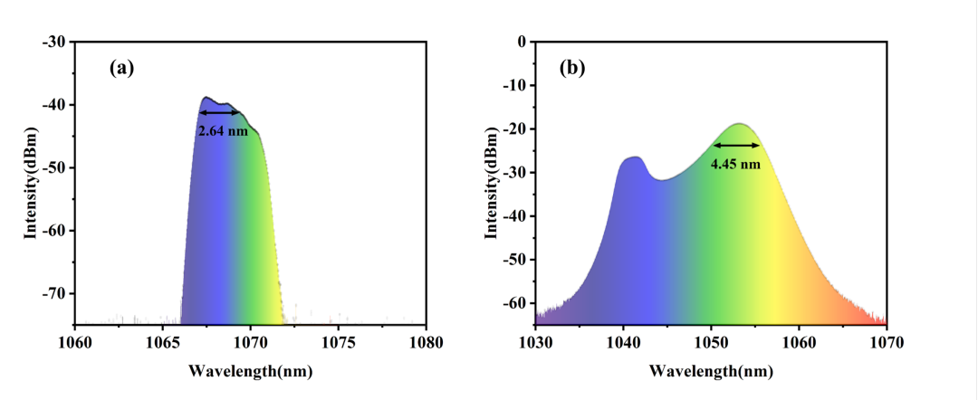 图3 (a) 色散补偿前光谱宽度;(b)色散补偿后光谱宽度