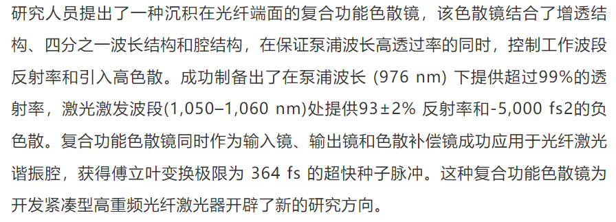 近日,中国科学院上海光学精密机械研究所薄膜光学实验室与华南理工大学韦小明教授团队合作在高重频超快光纤激光腔内色散补偿方面取得新进展,相关成果发表在Optics Express上。