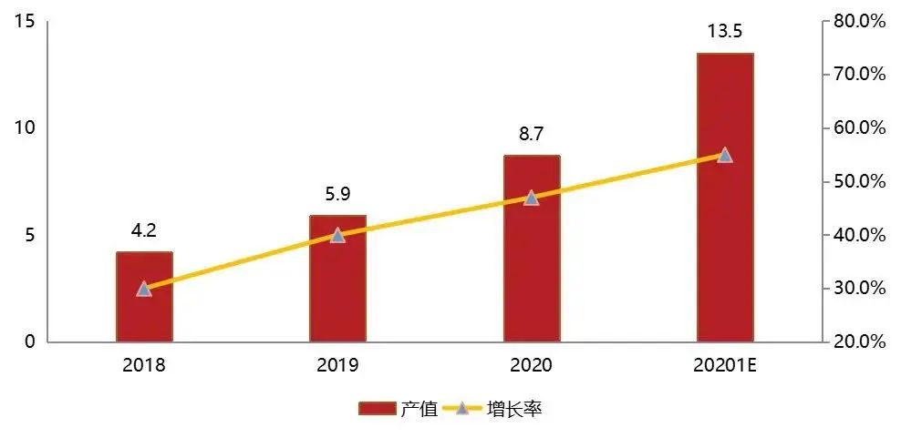 2018年-2021年中国激光器用特种光纤产值(单位:亿元)