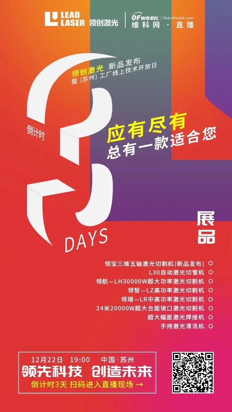 2021年12月22日19:00,领创激光将在线上举办的新品发布暨线上技术开放日活动。将为您带来行业先进的三维激光切割机新品发布,三万瓦超高功率的稳定切割,超大幅面坡口激光切割机等。