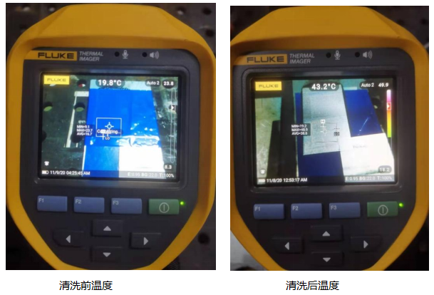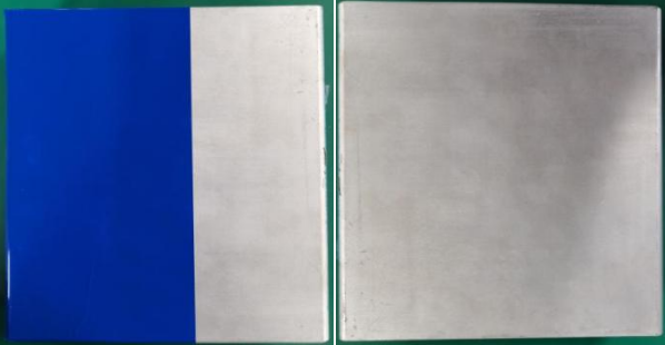 注:温度变化情况——在室温环境下,电池盒铝合金蓝膜表面两次出光清洗后蓝膜去除掉,未有胶层颗粒附着,测得的表面温度43.2℃,然后立即表面温度降低,基材不发生任何形变。