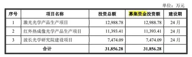 据招股说明书的信息披露,波长光电拟募资3.19亿元用于激光光学产品生产项目、红外热成像光学产品生产项目和波长光学研究院建设项目。