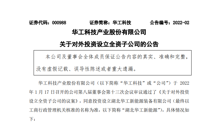 1月17日下午,华工科技产业股份有限公司(简称“华工科技”)发布公告称,根据公司战略发展需要,为进一步完善公司在消费锂电、太阳能光伏、动力电池等方面的业务布局和资源投入,公司全资子公司深圳华工新能源装备有限公司(以下简称“深圳华工新能源”)拟以自有资金人民币 1 亿元对外投资设立全资子公司湖北华工新能源装备有限公司。