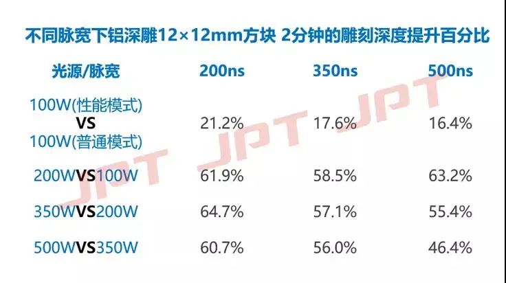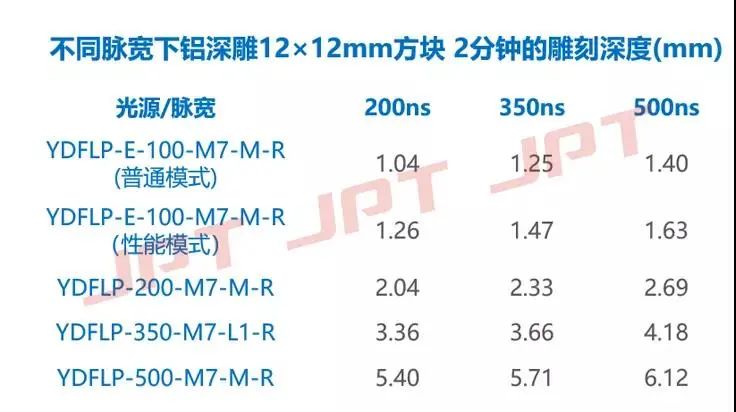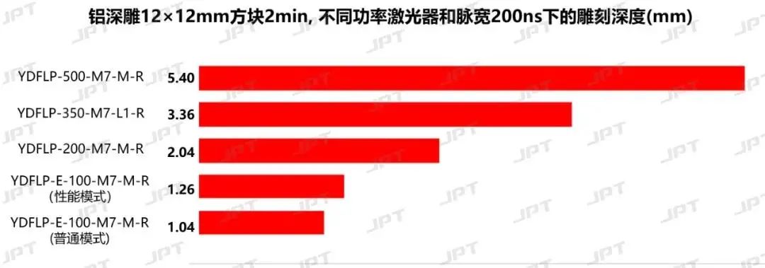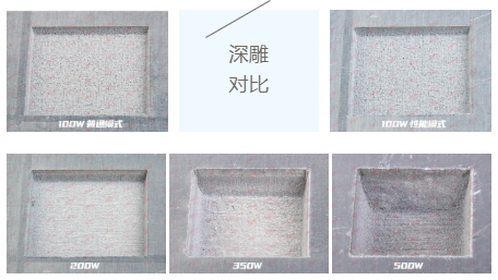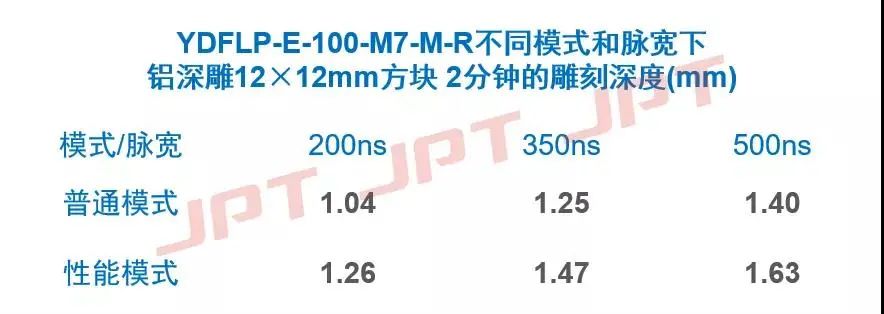 在相同填充、脉宽、频率和速度设置下深雕12mm×12mm的正方形铝块2分钟,YDFLP-E-100-M7-M-R的性能模式比普通模式的雕刻深度可提升16%-21%。