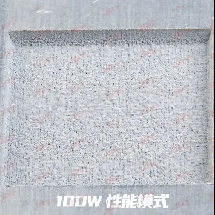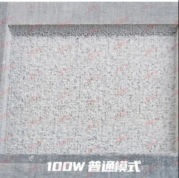应用YDFLP-E-100-M7-M-R的两种不同模式,在相同填充、脉宽、频率和速度设置下深雕铝图形为12mm×12mm的正方形,深雕时间2分钟,结果如下:
