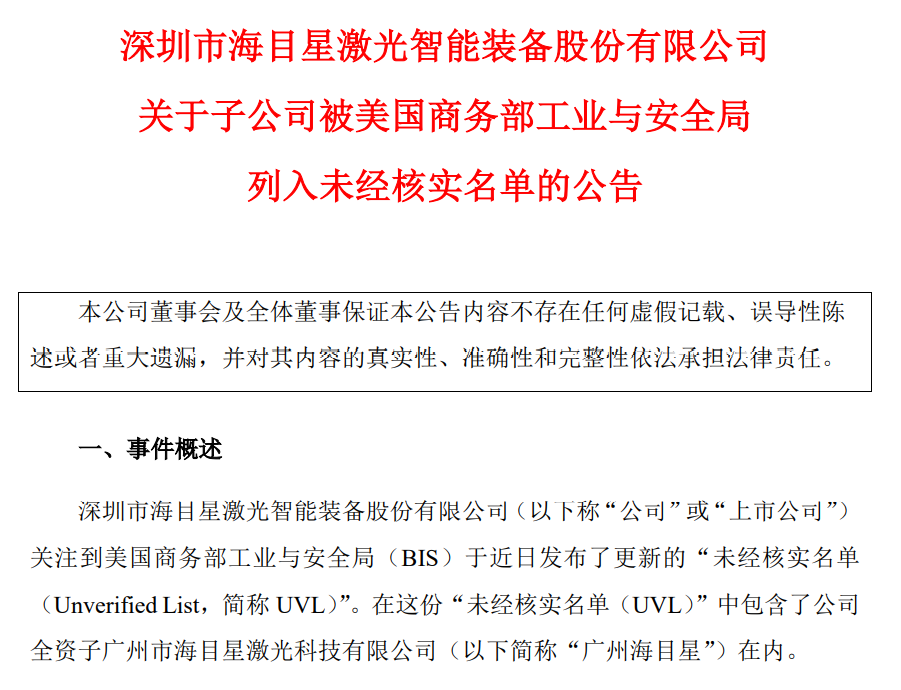 2月8日,海目星发布公告称,公司关注到美国商务部工业与安全局(BIS)于近日发布了更新的“未经核实名单(Unverified List,简称UVL)”。在这份“未经核实名单(UVL)”中包含了公司全资子广州市海目星激光科技有限公司(以下简称“广州海目星”)在内。