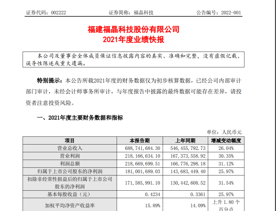 2月22日,福建福晶科技股份有限公司 (以下简称“福晶科技”)发布2021年业绩快报。2021年实现营业总收入6.89亿元,同比增长26.04%;实现利润总额2.19亿元,同比增长31.12%;实现归属于上市公司股东的净利润1.81亿元,同比增长25.97%,加权平均净资产收益率同比上升1.80个百分点。