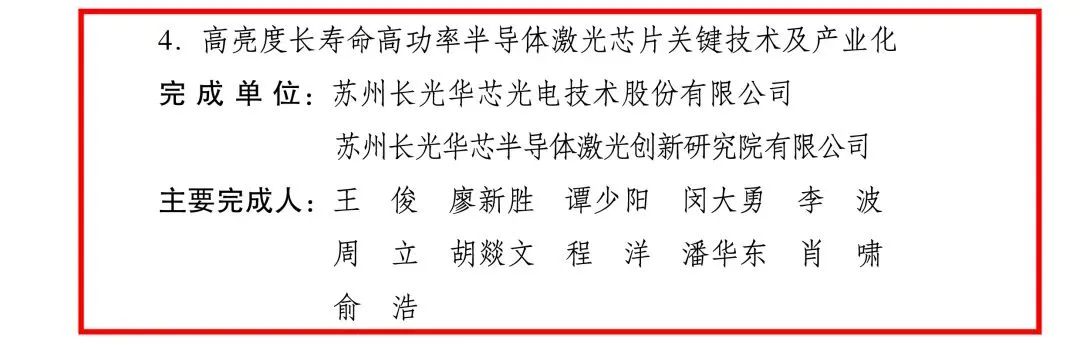 获得本次江苏省科学技术奖一等奖的是由长光华芯独立申报的“高亮度长寿命高功率半导体激光芯片关键技术及产业化”项目。