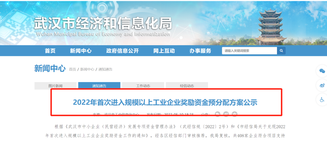 2022年5月10日,根据《武汉市中小企业(民营经济)发展专项资金管理办法》(武经信规〔2022〕2号)和《市经信局关于兑现2022年首次进入规模以上工业企业奖励资金工作的通知》,武汉市经信局将2022年首次进入规模以上工业企业奖励资金预分配方案予以公示。(具体名单见文末)