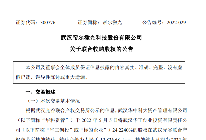 5月23日晚,武汉帝尔激光发布公告称,拟与武汉精测电子集团股份有限公司(以下简称“精测电子”)组成联合体,收购武汉华中科大资产管理有限公司(以下简称“华科资管”)所持武汉华工创业投资有限责任公司(以下简称“华工创投”)24.224%的股权(对应出资额为0.33亿元)。