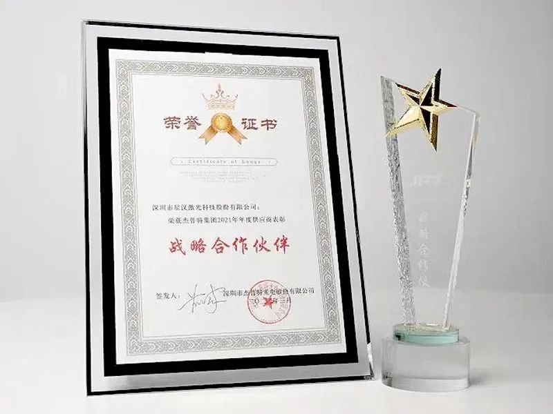 星汉激光荣获杰普特集团2021年年度最佳供应商表彰——战略合作伙伴,双方将携手打造性能强大、可靠性高的激光器系列产品,助力国家智能制造,持续为用户创造价值。