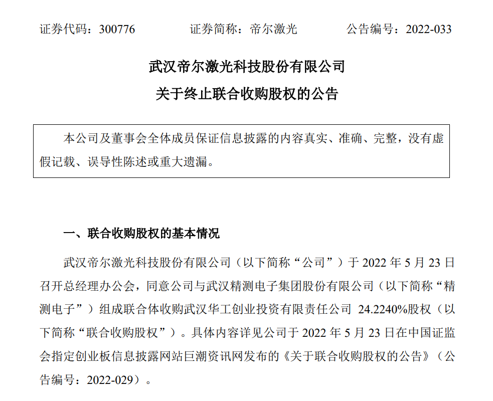 5月29日,帝尔激光发布公告称,此前披露,公司于2022年5月23日召开总经理办公会,同意公司与武汉精测电子集团股份有限公司(“精测电子”)组成联合体收购武汉华工创业投资有限责任公司24.2240%股权。