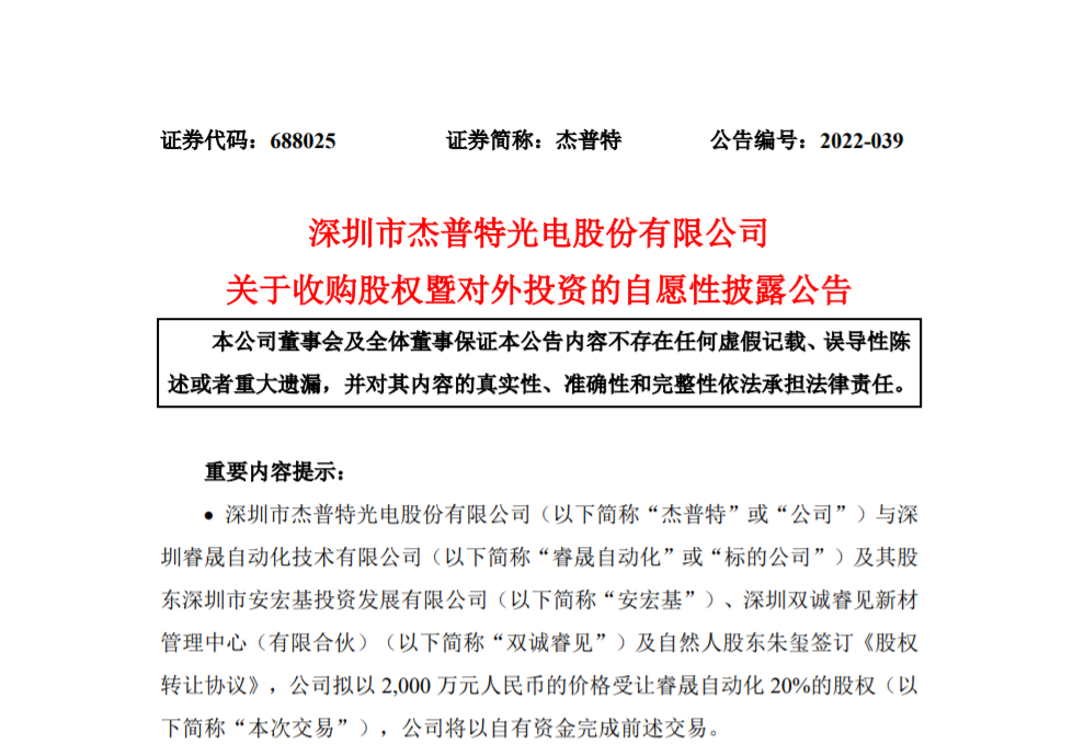 公告显示,为进一步完善公司产业链布局,推进公司战略规划实施,杰普特与睿晟自动化、安宏基、双诚睿见、朱玺签订《股权转让协议》,拟以 2,000 万元人民币的价格受让睿晟自动化 20%的股权,将以自有资金完成前述交易。