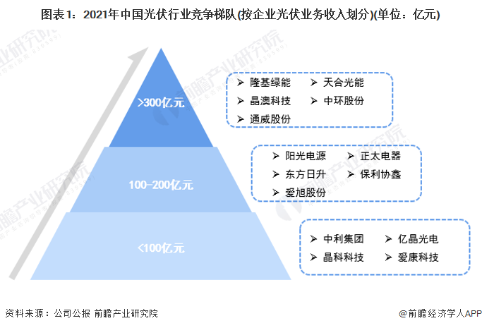 光伏是我国能源供应体系的重要分支,也是新能源的重要组成部分。根据2021年企业光伏业务收入,可将光伏头部企业大体分为3个竞争梯队。其中,营业收入大于300亿元的企业有隆基绿能、天合光能、晶澳科技、中环股份、通威股份,其中隆基绿能以809亿元的光伏业务营收遥遥领先于其后的几家企业;光伏业务收入在100-200亿元之间的企业有阳光电源、中环股份、正泰电器、东方日升、保利协鑫和爱旭股份;光伏业务收入小于100亿元的有中利集团、亿晶光电、晶科科技和爱康科技。