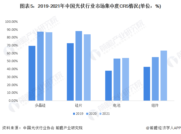 根据中国光伏行业协会数据显示,2021年光伏行业实现稳步增长,多晶硅、硅片、电池片、组件产量分别达到50.5万吨、227吉瓦(GW)、198吉瓦、182吉瓦,同比分别增长28.8%、40.7%、46.9%、46.1%,这4个环节产值突破7500亿元。同时,产业集中度进一步提升。多晶硅、硅片、电池片、组件4个环节,产量排名前五企业在国内总产量中的占比分别为86.7%、84%、53.9%和63.4%,头部企业规模优势明显。