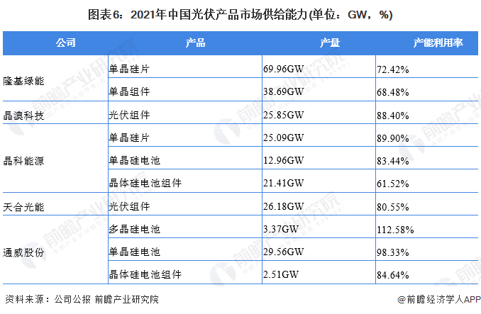 结合光伏产业市场重点公司光伏产品产量及产能利用率情况来看,2021年,中国光伏产品市场供给能力较强,隆基绿能光伏产品产量遥遥领先于其他公司,单晶硅片产量达到69.96GW,单晶组件产量达到38.69GW。从产能利用率角度来看,2021年光伏市场各公司产能利用率不高,仍有较大提升空间。