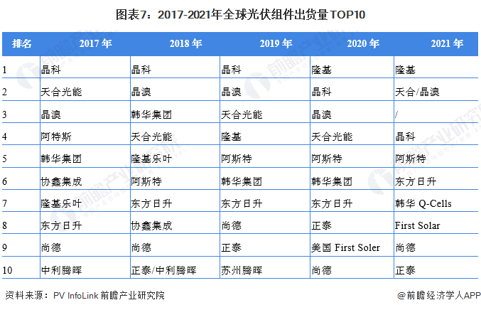 从竞争格局来看,在全球光伏组件市场中,我国光伏行业在组件环节的优势较大,近五年以来,在全球的竞争对手仅有美国的First Soler,韩国的韩华集团。