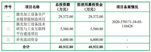 本次发行股票拟募资4.09亿元。其中,激光加工设备全产业链智能制造项目,项目投资总额约2.94亿元;激光加工设备技术研发与工业互联网平台建设项目,项目投资总额5560.80万元;补充流动资金,项目投资总额6000万元。