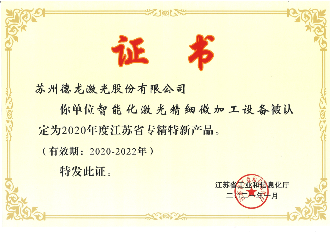 德龙激光多项产品被评为江苏省首台(套)重大装备产品、江苏省专精特新产品、江苏省科学技术奖三等奖、苏州市技术发明奖、苏州市科学技术进步奖一等奖、苏州市科学技术进步奖三等奖、苏州市核心技术产品等。