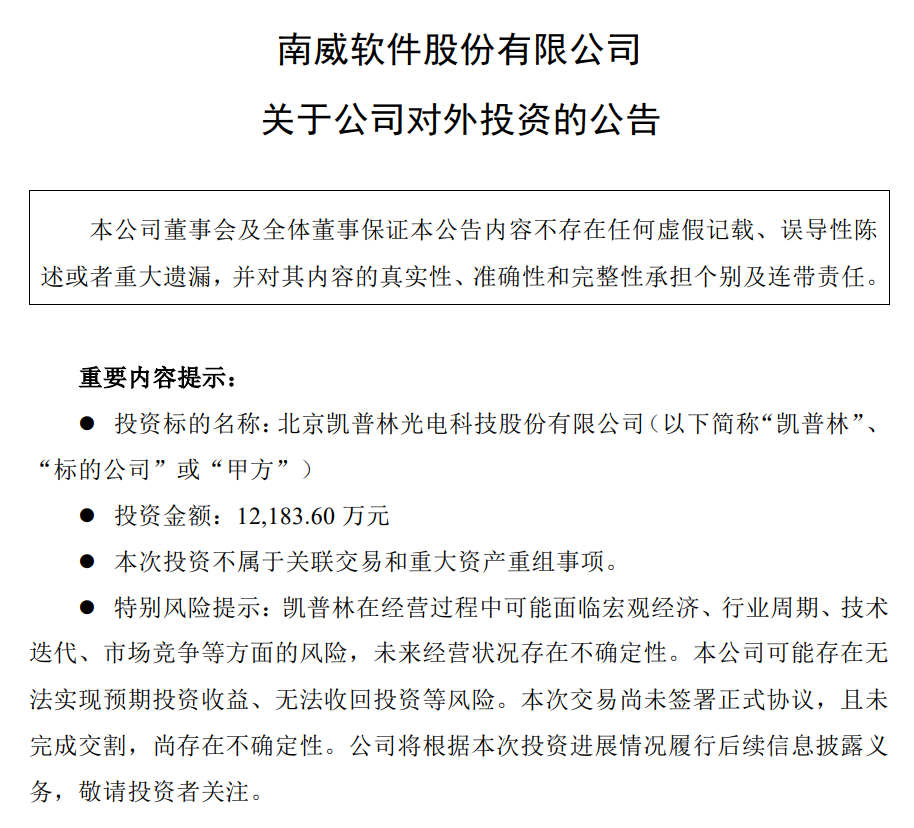 6月20日,南威软件发布公告称,拟与凯普林、水木韶华合伙企业、陈晓华先生及赵鸿飞先生签订《北京凯普林光电科技股份有限公司增资协议》及《北京凯普林光电科技股份有限公司增资协议之补充协议》,公司拟以自有资金向凯普林出资约1.22亿元(其中426.00万元记入实收资本,剩余约1.18亿元记入资本公积),增资完成后公司将持有凯普林5.3692%的股份。