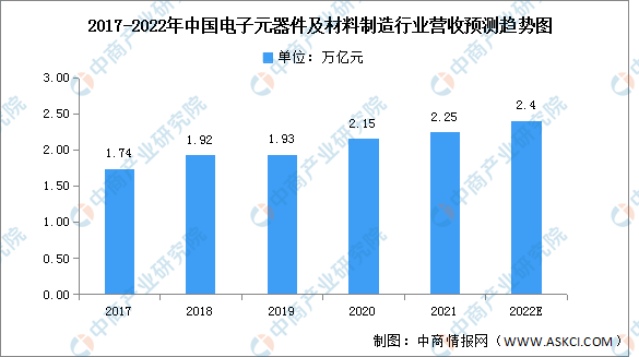 随着下游市场消费电子、汽车电子、工业电子等多个行业的高速发展以及新能源汽车、物联网、新能源等新兴领域的兴起,我国电子元件及电子专用材料制造的需求迅速扩大,带动行业的快速发展。2020年中国电子元件及电子专用材料制造行业营业收入2.15万亿元,同比增长11.3%,预计2022年营业收入可达2.4万亿元。