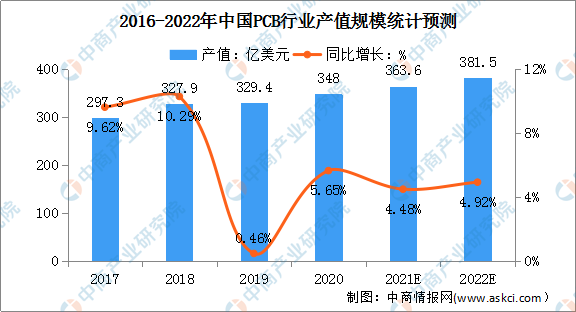 近年来,我国不断引进国外先进技术与设备,发展PCB行业,PCB行业产值增长迅速,已成为全球PCB生产制造中心。数据显示,我国PCB行业产值由2017年的297.3亿美元增至2020年的348亿美元,年均复合增长率5.4%,高于全球平均增长水平。未来PCB行业预计仍将维持较高速的增长,预计在2022年我国PCB行业可达到381.5亿美元,同比增长4.92%。