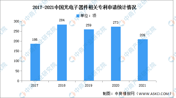 由于中国光电子器件发展迅速、国家支持力度不断增长,我国光电子器件的研发进程也不断加快。2021年中国光电子器件相关专利申请数量达209项,同比下降23.4%。