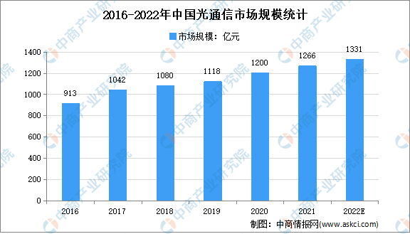 随着光芯片、光器件的技术进步、成本下降,光通信行业将能够更好地应对未来海量数据以及高速运算要求带来的巨大压力,光通信行业有望保持持续增长。据数据显示,2015年-2019年我国光通信市场规模逐步增长,2020年约为1200亿元。中商产业研究院预测,2022年我国光通信市场规模将达1331亿元。