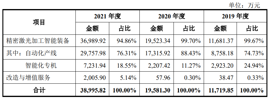 招股说明书显示,逸飞激光主营业务为精密激光加工智能装备的研发、设计、生产和销售,主要产品包括锂电池电芯自动装配线、模组/PACK 自动装配线等自动化产线及各类精密激光加工智能化专机,广泛应用于锂电池、家电厨卫和装配式建筑等行业。报告期内,主营业务收入的构成如下: