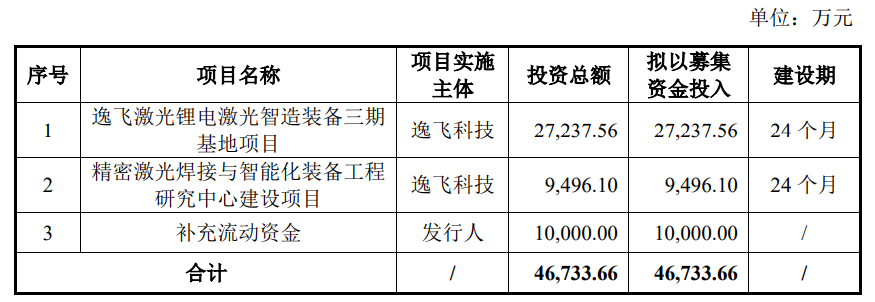 本次募集资金用于项目及拟投入的募资金额为:逸飞激光锂电激光智造装备三期基地项目,拟以募集资金投入约2.72亿元;精密激光焊接与智能化装备工程研究中心建设项目,拟以募集资金投入9496.10万元;补充流动资金,拟以募集资金投入1亿元。