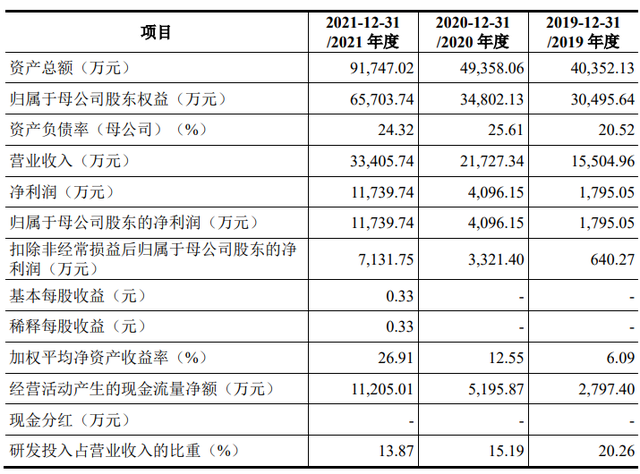 财务数据显示,公司2019年、2020年、2021年营收分别为1.55亿元、2.17亿元、3.34亿元;同期对应的归母净利润分别为1795.05万元、4096.15万元、1.17亿元。
