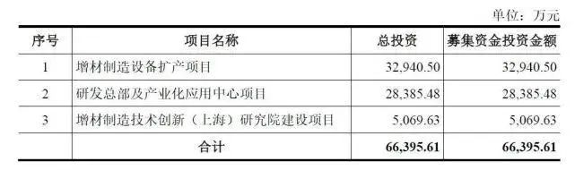 本次募集资金用于项目及拟投入的募资金额为:增材制造设备扩产项目,募集资金投资金额约3.29亿元;研发总部及产业化应用中心项目,募集资金投资金额约2.84亿元;增材制造技术创新(上海)研究院建设项目,募集资金投资金额5069.63万元。