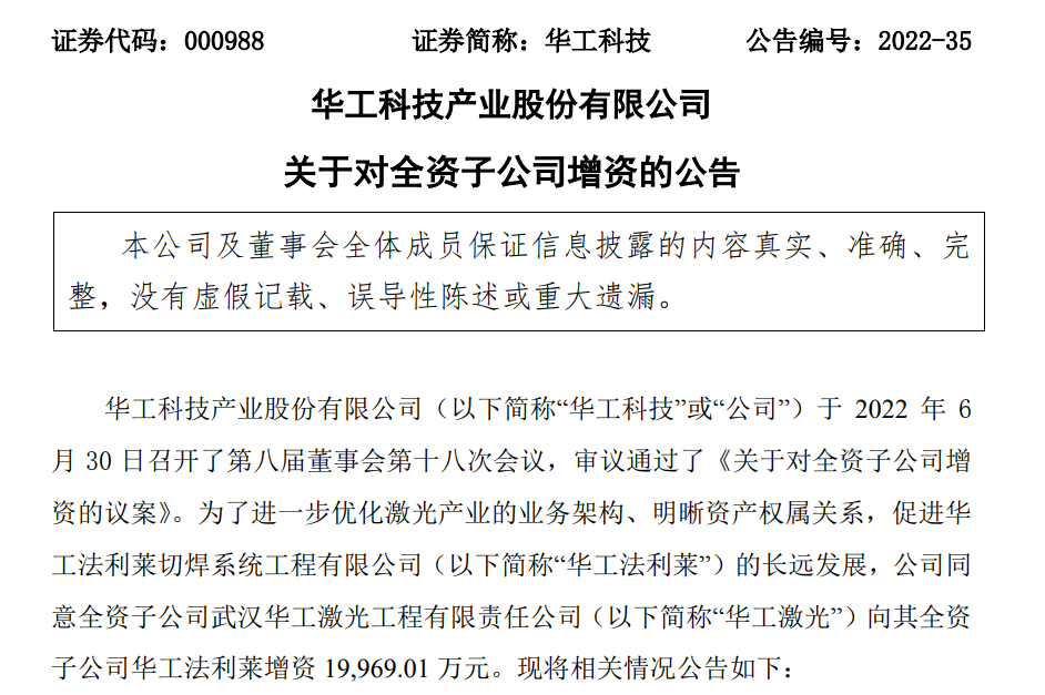 7月1日,华工科技发布公告称,为了进一步优化激光产业的业务架构、明晰资产权属关系,促进华工法利莱的长远发展,公司同意全资子公司武汉华工激光向其全资子公司华工法利莱增资 19,969.01 万元。