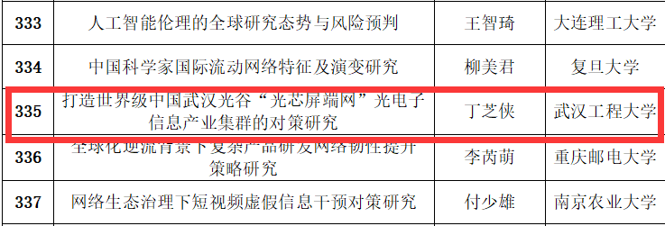 名单显示,有2人以光电领域课题研究项目入选。北京工业大学潘瑞凭借“透明陶瓷/金属超快激光连接前沿技术的发展趋势与战略研究”课题入选;武汉工程大学丁芝侠凭借“打造世界级中国武汉光谷"光芯屏端网"光电子信息产业集群的对策研究”课题入选。