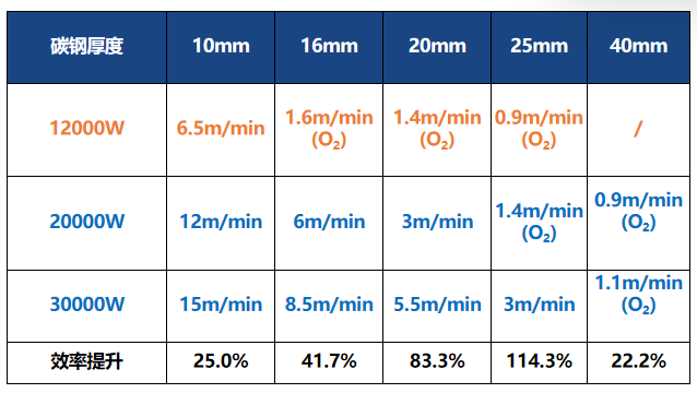从表中可以看出,30kW辅助空气切割10mm厚度的碳钢相较20kW效率提升了25%,效率相较虽有提升,但优势并不非常明显,而在切割25mm厚度的碳钢优势明显,30kW的效率相较20kW (辅助氧气)提升114.3%。