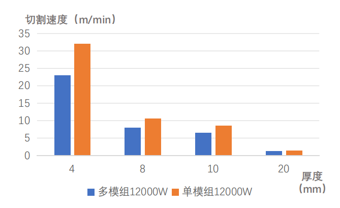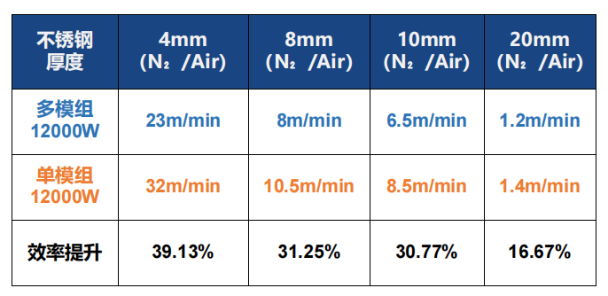 单模组万瓦激光器的优势在中薄板切割速度,以锐科单模组12000和多模组12000激光器进行对比,在20mm以下不同厚度的不锈钢辅助氮气或空气切割条件下,单模组12000切割效率优于多模组12000光纤激光器。