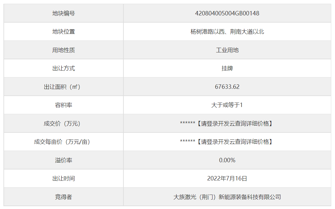 该地块位于杨树港路以西、荆南大道以北,工业用地,出让年限 50年,出让总用地面积为67633.62㎡,建设用地面积67633.62㎡,容积率大于或等于1,起始价969.00万元,最终由大族激光(荆门)新能源装备科技有限公司以底价969.00万元(9.55万元/亩)成交。