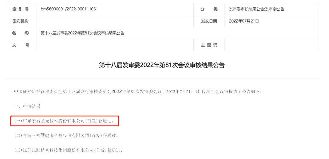 7月21日,中国证券监督管理委员会第十八届发审委2022年第81次会议审议结果公告:广东宏石激光技术股份有限公司(首发)获通过。