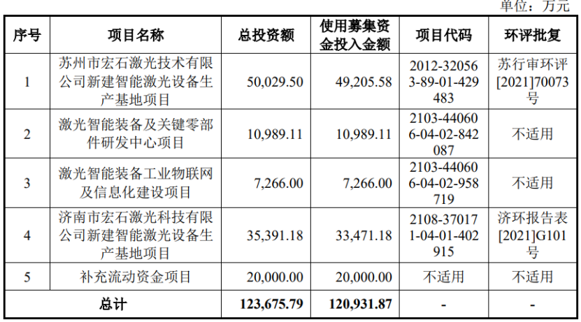 本次宏石激光计划募集资金12.09亿元,分别用于苏州市宏石激光技术有限公司新建智能激光设备生产基地项目、激光智能装备及关键零部件研发中心项目、激光智能装备工业物联网及信息化建设项目、济南市宏石激光科技有限公司新建智能激光设备生产基地项目、补充流动资金项目。