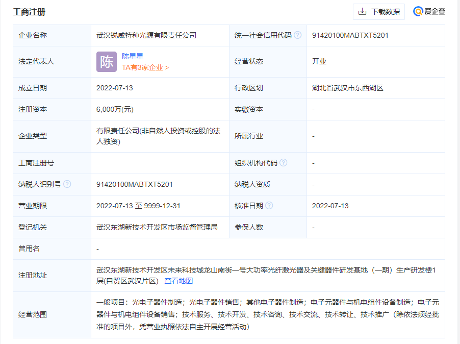 7月13日,锐科激光成立全资子公司武汉锐威特种光源有限责任公司,注册资本为6000万元,法定代表人为陈星星。
