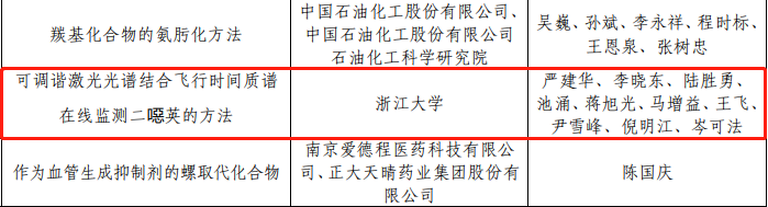 中国专利金奖项目名单里,涉及激光领域的获奖专利共有3项。分别是浙江大学的“可调谐激光光谱结合飞行时间质谱在线监测二噁英的方法”,温州大学、江苏大学、东南大学的“一种飞机叶片榫槽底部平面激光冲击强化方法和装置”,中国科学院国家授时中心的“基于铯原子饱和吸收谱的半导体自动稳频激光器”。