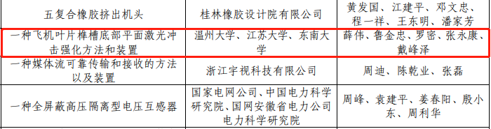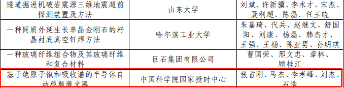 中国专利优秀奖项目名单,涉及激光领域的获奖专利有12项。分别是深圳创维-RGB 电子有限公司的“一种激光电视的图像处理方法、系统及激光电视”,青岛海信激光显示股份有限公司的“一种激光光源和投影显示设备”,深圳市海目星激光智能装备股份有限公司的“一种在电芯极片上的激光切割方法和装置”,武汉帝尔激光科技股份有限公司的“一种全自动太阳能电池片激光加工设备”,中国电建集团西北勘测设计研究院有限公司的“基于三维激光扫描技术的崩滑体地质灾害体监测方法”,国营芜湖机械厂的“一种高强塑积激光熔覆层及其制备方法”,华工法利莱切焊系统工程有限公司的“异型管用主轴箱以及激光切割机”,自然资源部国土卫星遥感应用中心的“一种预先确定星载激光测高仪的足印位置的方法”,北京大学的“飞秒脉冲激光调制器及具有其的微型双光子显微成像装置”,奥比中光科技集团股份有限公司的“用于 3D 成像的激光阵列”,中元汇吉生物技术股份有限公司的“基质辅助激光解析飞行时间质谱仪样品靶的进出装置”,上微电子装备(集团)股份有限公司的“一种激光退火装置”。