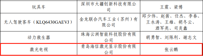 中国外观设计银奖项目名单,涉及激光领域的获奖专利有1项,青岛海信激光显示股份有限公司的“激光电视”。