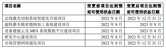 由于受到新冠疫情等因素的影响,自建综合楼处于在建状态,导致“总线激光切割系统智能化升级项目”“超快激光精密微纳加工系统建设项目”“设备健康云及 MES系统数据平台建设项目”“研发中心建设项目”“市场营销网络强化项目”的相关建设内容缺乏实施的必要场所,实施进度未达预期。为提高募集资金利用率,根据公司目前实际情况,拟有计划、分步骤逐步将募集资金投入上述项目,故将上述“总线激光切割系统智能化升级项目”“研发中心建设项目”“市场营销网络强化项目”项目的达到预定可使用状态时间调整至 2022 年12 月 31 日,将“设备健康云及 MES 系统数据平台建设项目”“超快激光精密微纳加工系统建设项目”项目的达到预定可使用状态时间调整至 2023 年 8 月。